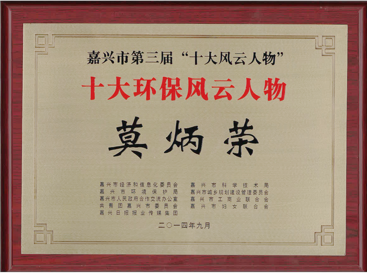 9月18日,,,,,在嘉兴市第三届“十大风云人物”颁奖仪式上,,,,,公司董事长兼总司理莫炳荣同时荣获“嘉兴市十大工业转型生长风云人物”、“嘉兴市十大环保风云人物”声誉称呼。。。