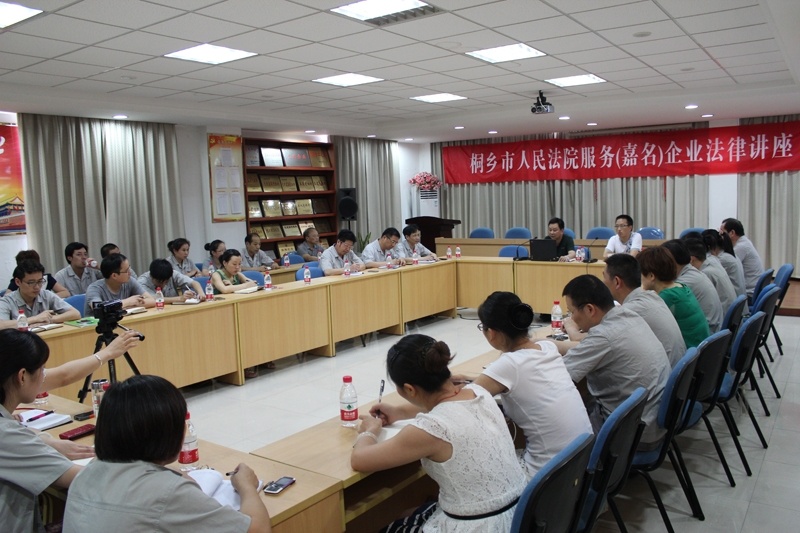 7月27日(周六)下昼,,,,应公司约请,,,,桐乡市人民法院走进尊龙凯时公司为企业提供执法效劳,,,,在公司行政楼三楼多功效厅,,,,举行了一次执法专题讲座 。。。。公司向导、营销中心各部分全体职员,,,,财务治理部、信用治理部、票鹄胛理部、采购物控部、经编事业部的营销、生产、财务认真人等30余人加入了聚会 。。。。